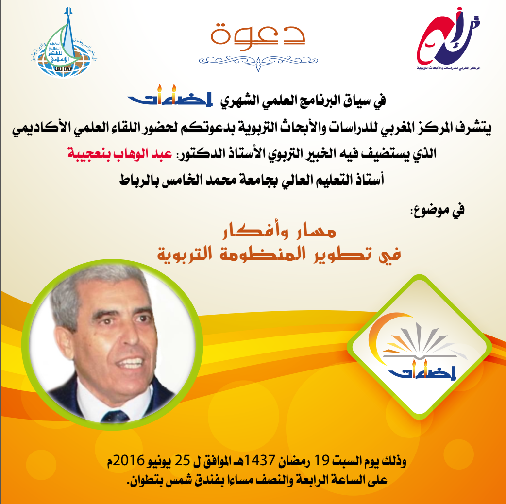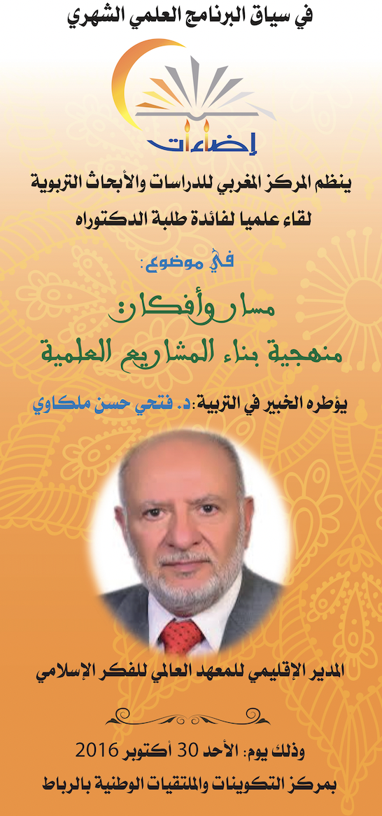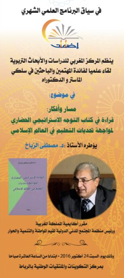 هو عبارة عن لقاء حواري - فكري وتربوي- ينظمه االمركز المغربي للدراسات والأبحاث التربوية سنة 2016، بهدف الاستفادة من خبرات وتجارب العلماء والمفكرين والخبراء التربويين، وإكساب الباحثين الجدد الدربة والصبر في مسار البحث العلمي، وتعريفهم بالعلماء والخبراء الوطنيين والدوليين، وتقاسم التجارب معهم، وتحقيق مقصد الاقتداء بهم.